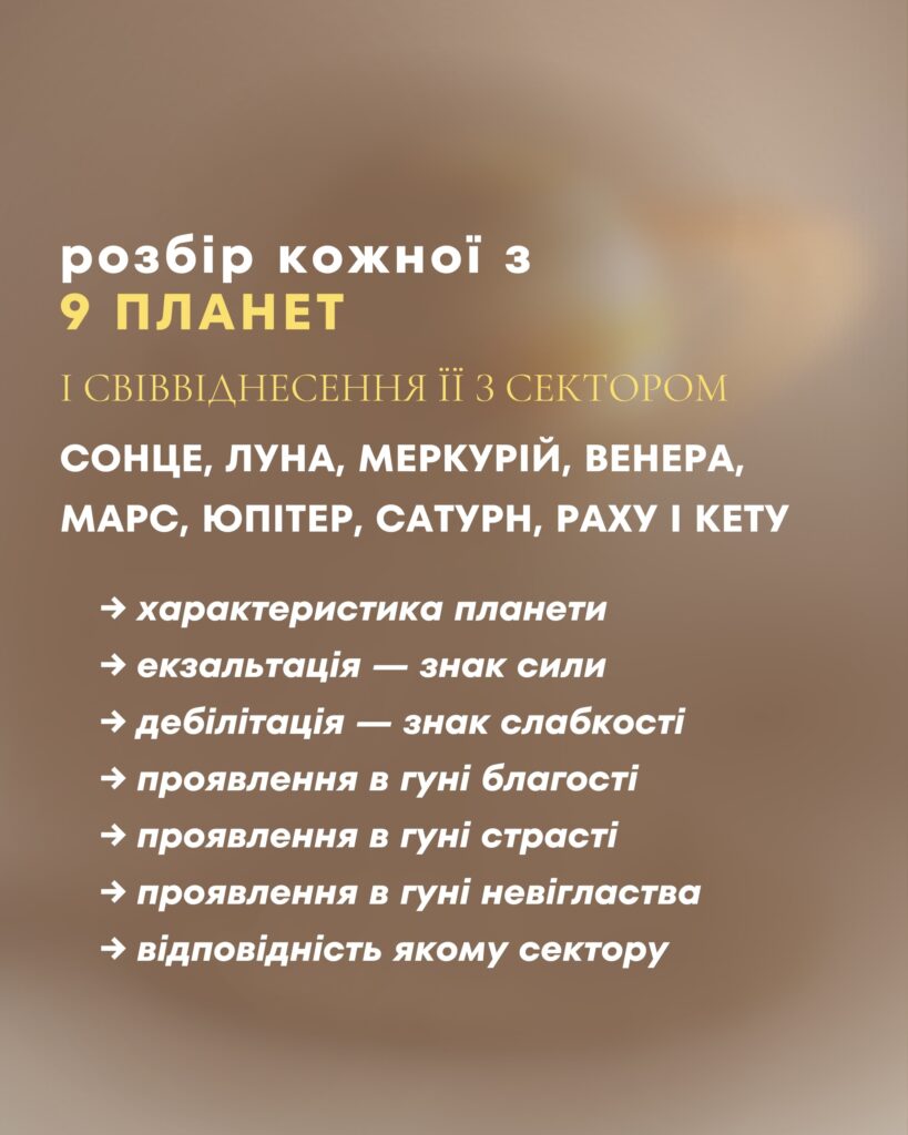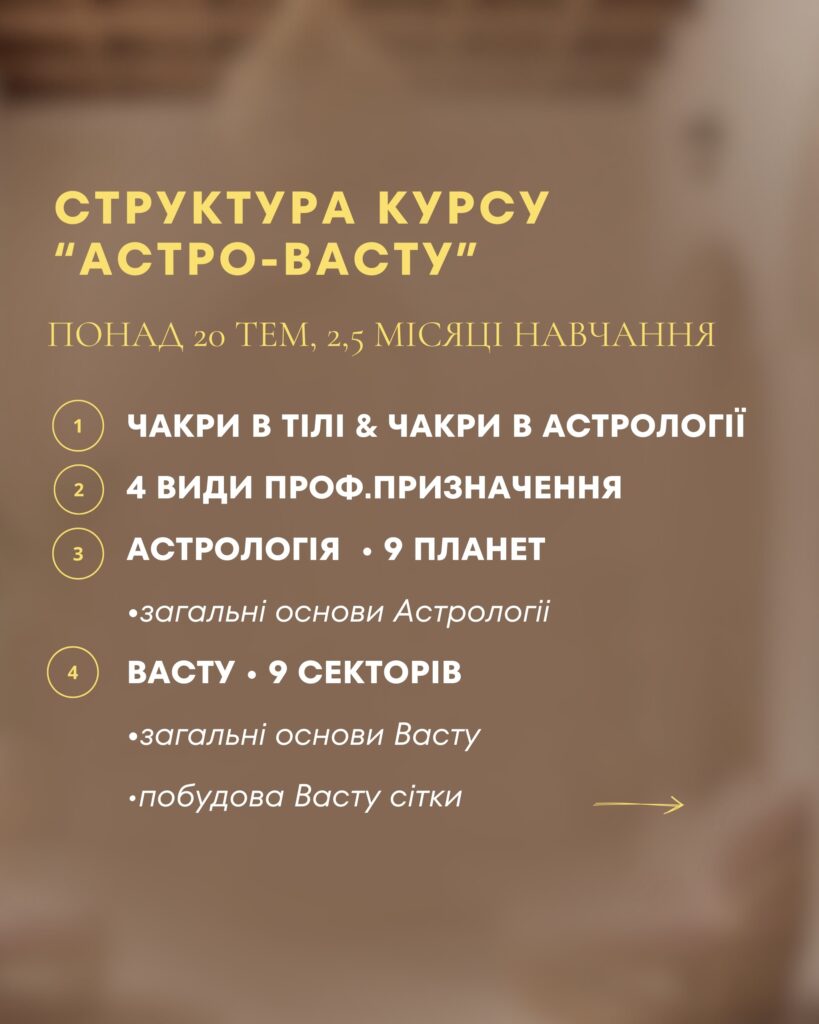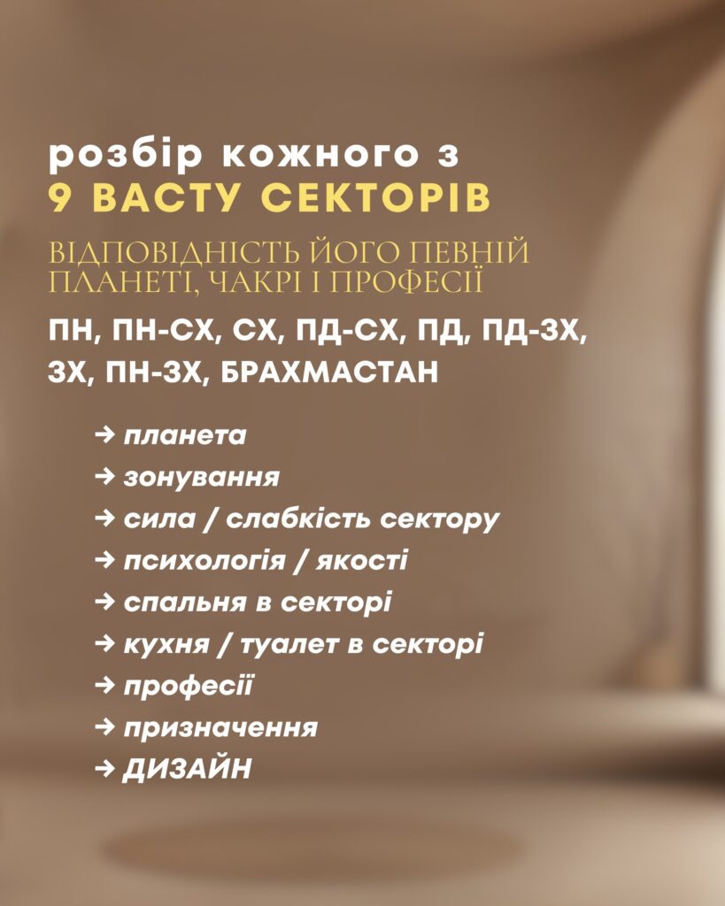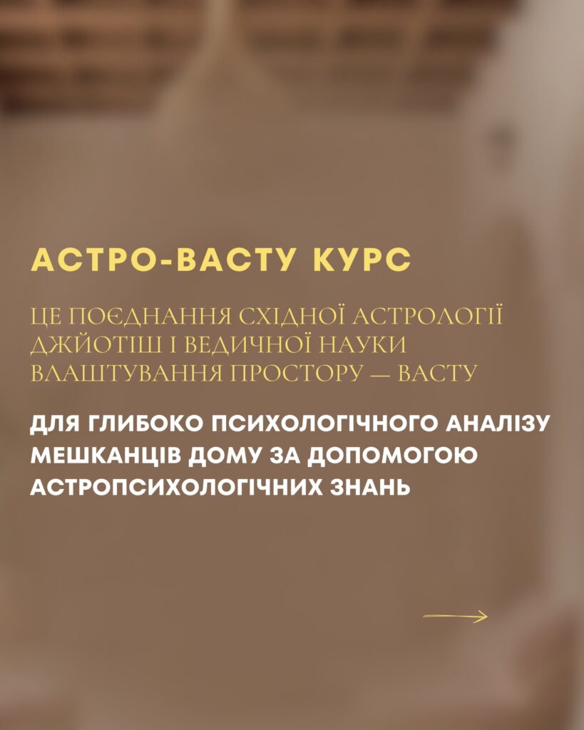 Це занурення у ведичну науку влаштування простору з додатковими трактуваннями по східній Астрології. Таким чином, цей курс — це Поєднання Астрології Джйотіш та Васту, це вміння трактувати енергії 9 секторів і 9 планет!